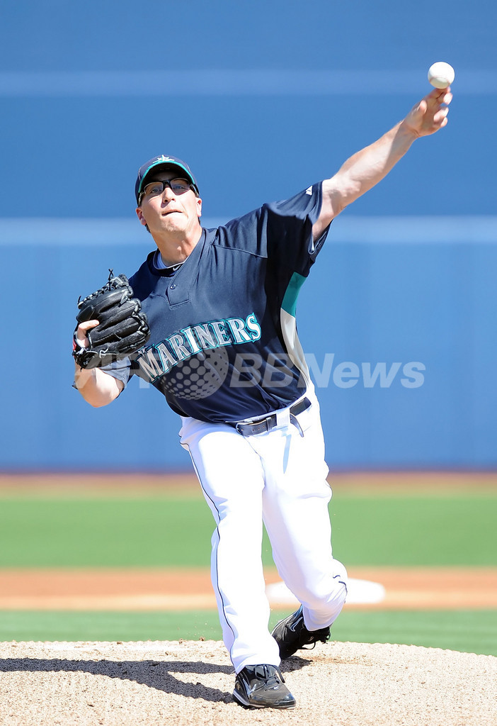 写真は先発登板し、2回を投げて無安打無失点だったマリナーズのルーク・フレンチ(%%Luke French%%)。(2010年3月5日撮影)(c)AFP/Getty Images/Lisa Blumenfeld