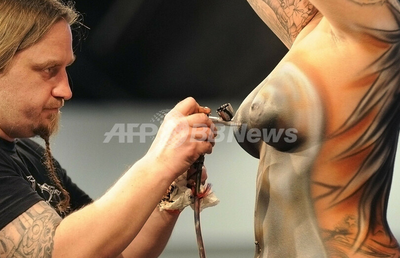 独フランクフルト(Frankfurt)で5日、第18回国際タトゥー・コンベンション(International Tattoo Convention)が開催され、各国の入れ墨アーティストが技を競い合った。写真は、デモンストレーションを行うボディペインティングのアーティスト(2010年3月5日撮影)。(c)AFP/DDP/THOMAS LOHNES