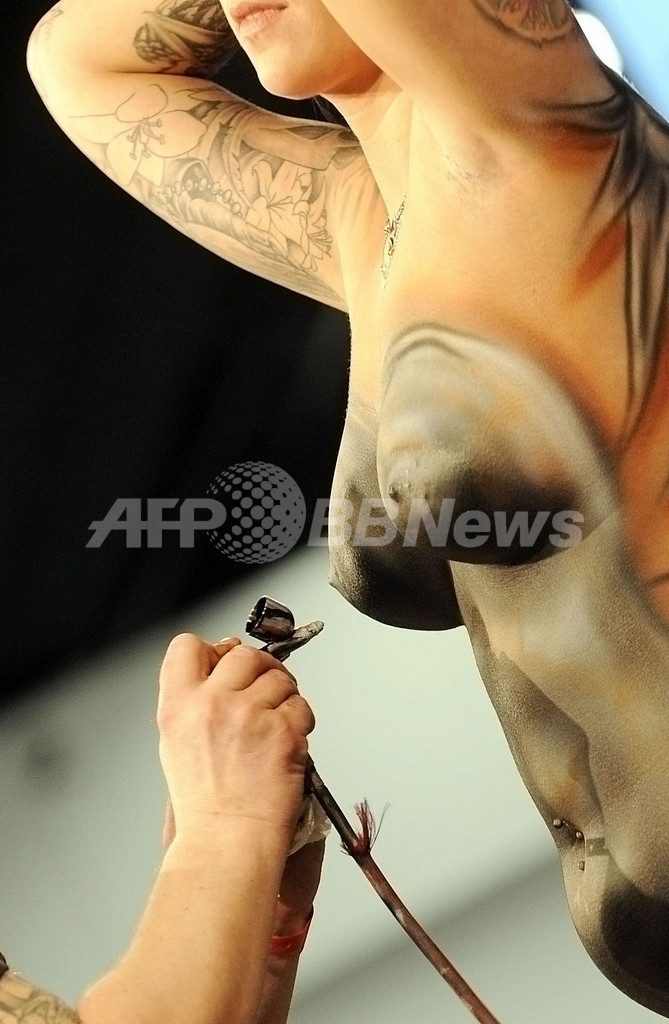 独フランクフルト(Frankfurt)で5日、第18回国際タトゥー・コンベンション(International Tattoo Convention)が開催され、各国の入れ墨アーティストが技を競い合った。写真は、デモンストレーションを行うボディペインティングのアーティスト(2010年3月5日撮影)。(c)AFP/DDP/THOMAS LOHNES