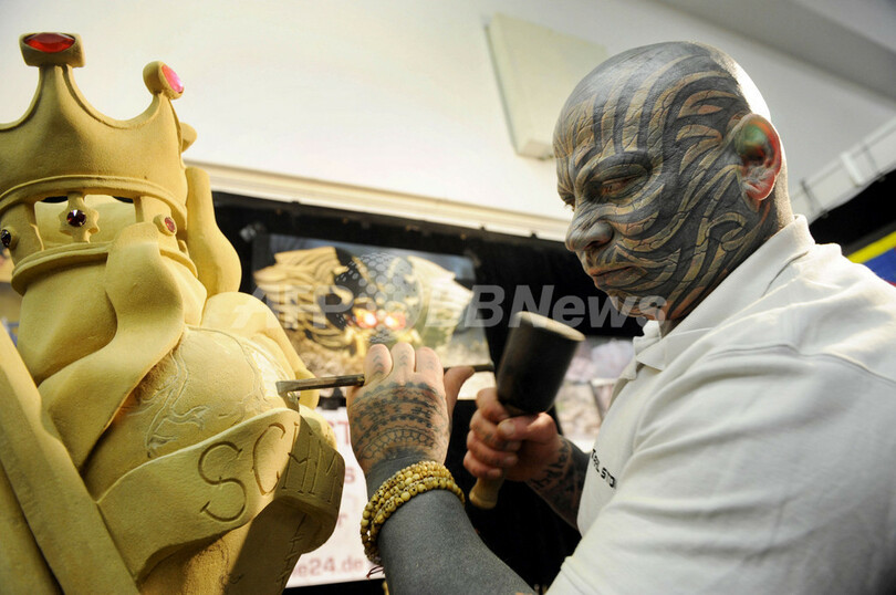 独フランクフルト(Frankfurt)で5日、第18回国際タトゥー・コンベンション(International Tattoo Convention)が開催され、各国の入れ墨アーティストが技を競い合った。写真は、作品を仕上げるwood carver さん(2010年3月5日撮影)。(c)AFP/DDP/THOMAS LOHNES