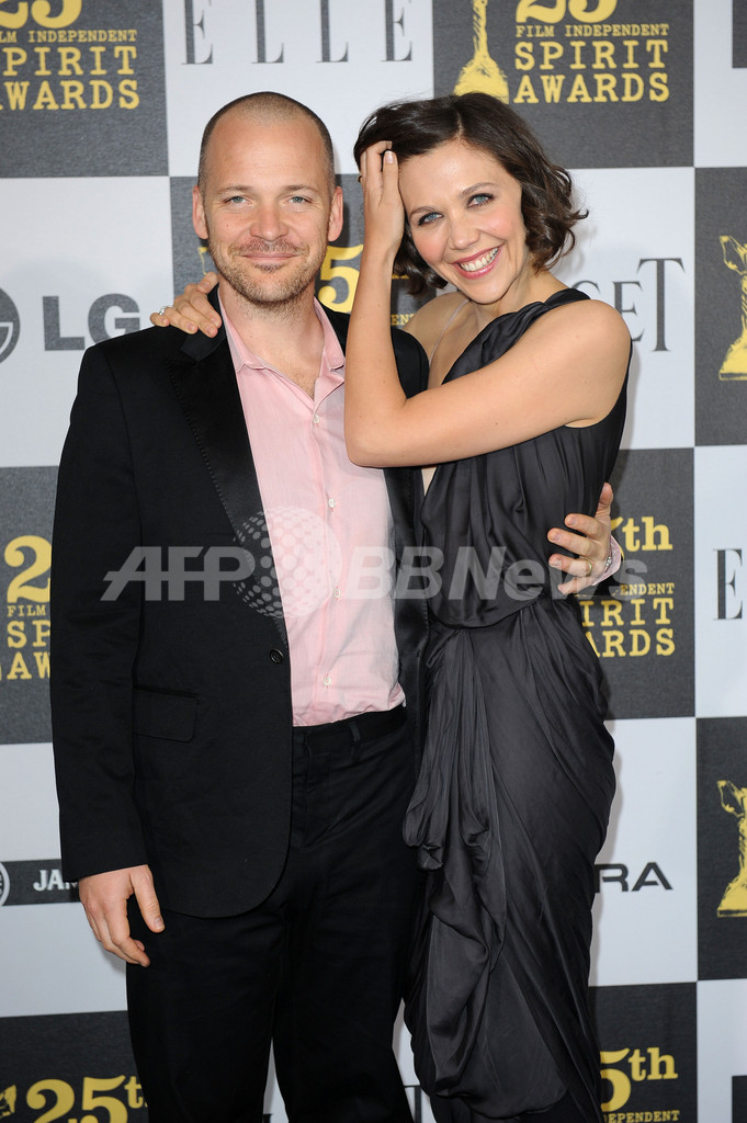 米カリフォルニア(California)州サンタモニカ(Los Angeles)で5日、2009年の最も優れた独立系映画を表彰するインディペンデント・スピリット賞(Independent Spirit Awards)の授賞式が開催され、多くのスターが出席した。写真は、会場に姿を見せた女優マギー・ギレンホール(Maggie Gyllenhaal、右)と夫で俳優のピーター・サースガード(Peter Sarsgaard、2010年3月5日撮影)。(c)AFP/Robyn BECK