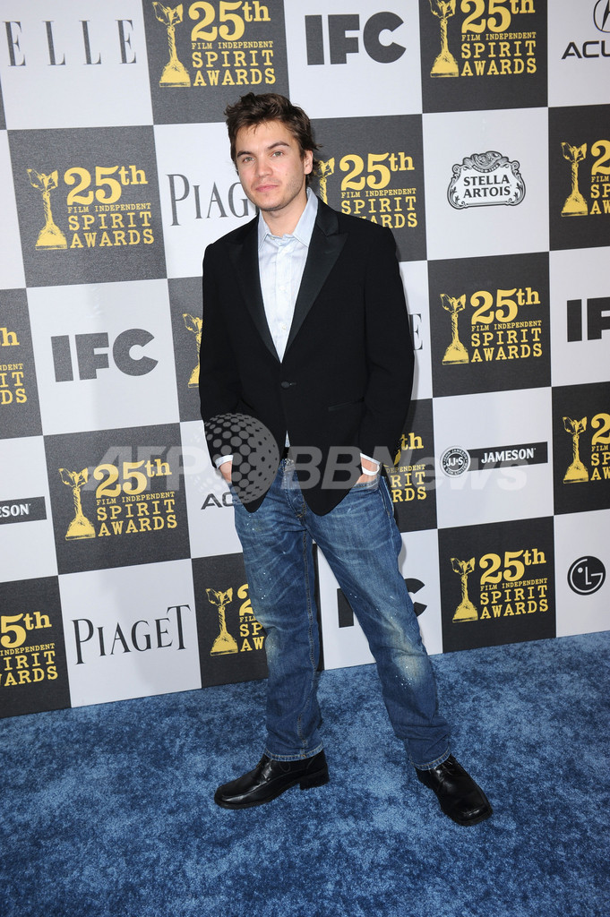 米カリフォルニア(California)州サンタモニカ(Los Angeles)で5日、2009年の最も優れた独立系映画を表彰するインディペンデント・スピリット賞(Independent Spirit Awards)の授賞式が開催され、多くのスターが出席した。写真は、会場に姿を見せた俳優エミール・ハーシュ(Emile Hirsch、2010年3月5日撮影)。(c)AFP/Robyn BECK