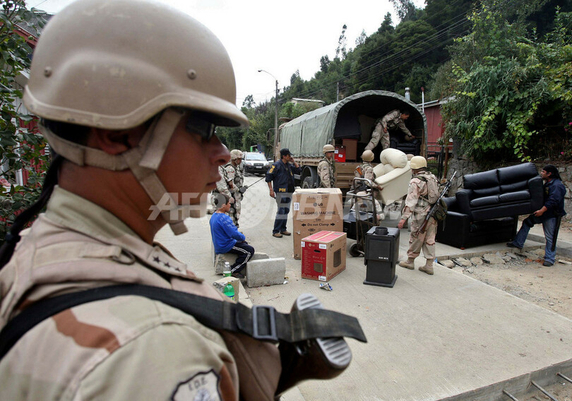 地震直後のチリでは略奪や暴動が相次いだため、夜間外出禁止令が発令され、兵士約1万4000人が配備された。(c)AFP