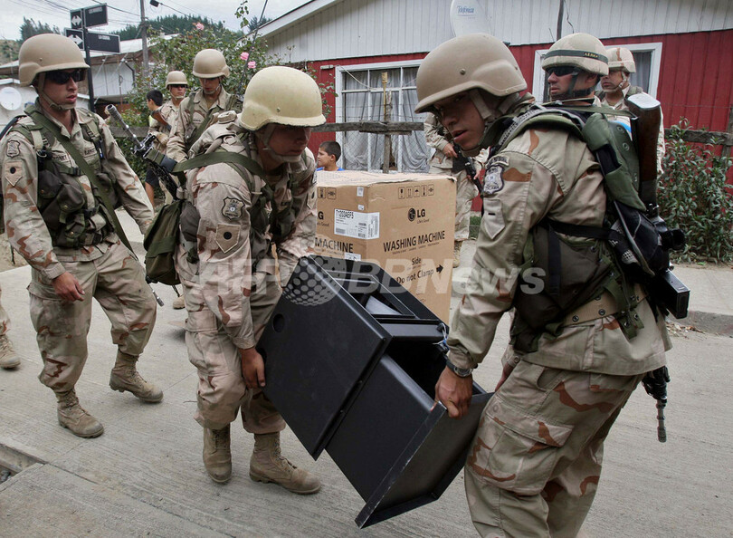 地震直後のチリでは略奪や暴動が相次いだため、夜間外出禁止令が発令され、兵士約1万4000人が配備された。(c)AFP