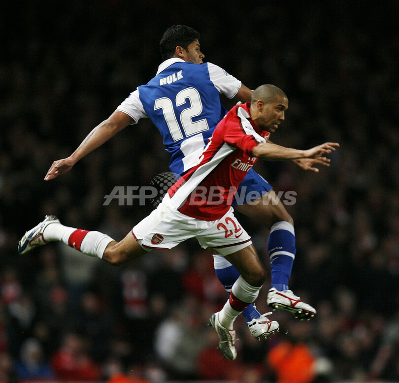 写真はポルトのフッキ(%%Hulk%%)と競り合うアーセナルのガエル・クリシー(%%Gael Clichy%%、右)。(2010年3月9日撮影)(c)AFP/IAN KINGTON
