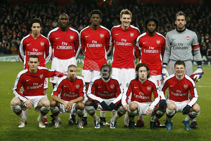 写真は試合前の記念撮影に臨むアーセナルの先発メンバー。(2010年3月9日撮影)(c)AFP/IAN KINGTON