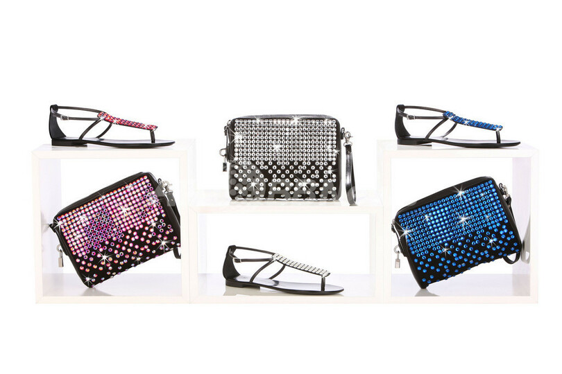 さらに、オープンを記念して、オンラインストア限定展開の“E-コレクション”が登場。輝くクリスタルをあしらったフラットサンダルとミニポシェットを展開する。