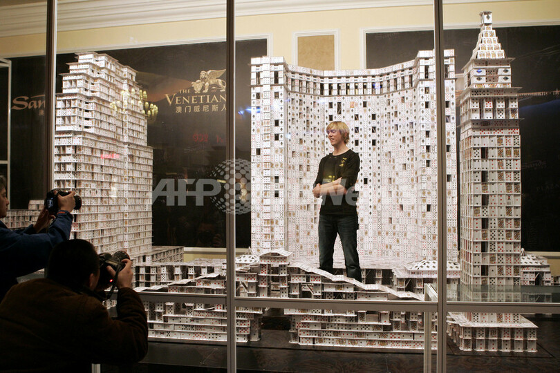 今回、バーグさんがマカオ(Macao)で44日間かけて作ったのは、同地にあるベネチアン・マカオ(Venetian Macao)、サンズ・マカオ(Sands Macao)、プラザ(Plaza)の巨大カジノリゾート3つのレプリカ。合計21万8792枚のトランプが使われている。(c)AFP
