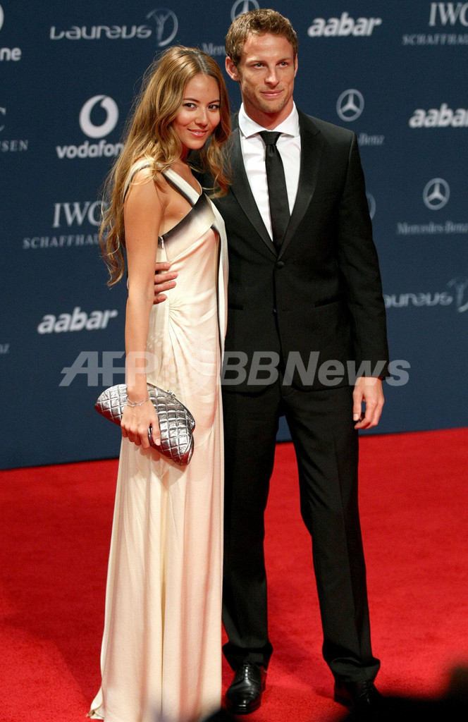 写真はブレークスルー賞に選出されたF1ドライバーのジェンソン・バトン(%%Jenson Button%%)、左は恋人の道端ジェシカ(%%Jessica Michibata%%)。(2010年3月10日撮影)(c)AFP/MARWAN NAAMANI