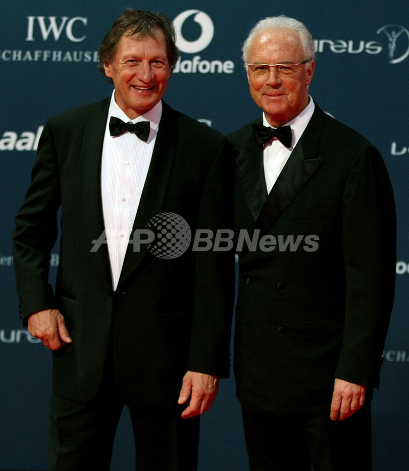 写真は友人と授賞式に出席したドイツの伝説的サッカー選手フランツ・ベッケンバウアー(%%Franz Beckenbauer%%)氏(右)。(2010年3月10日撮影)(c)AFP/MARWAN NAAMANI