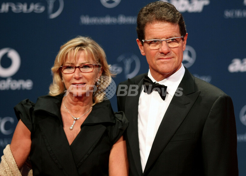 写真は夫人と授賞式に出席したサッカーイングランド代表のファビオ・カペッロ(%%Fabio Capello%%)監督(右)。(2010年3月10日撮影)(c)AFP/MARWAN NAAMANI