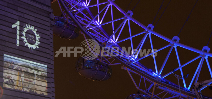 【3月11日 AFP】英国・ロンドン(London)の観光名所の1つ、大型観覧車「ロンドン・アイ(London Eye、別名ミレニアム・ホイール)」が運営開始から10周年を迎え、9日、ライトアップされた。