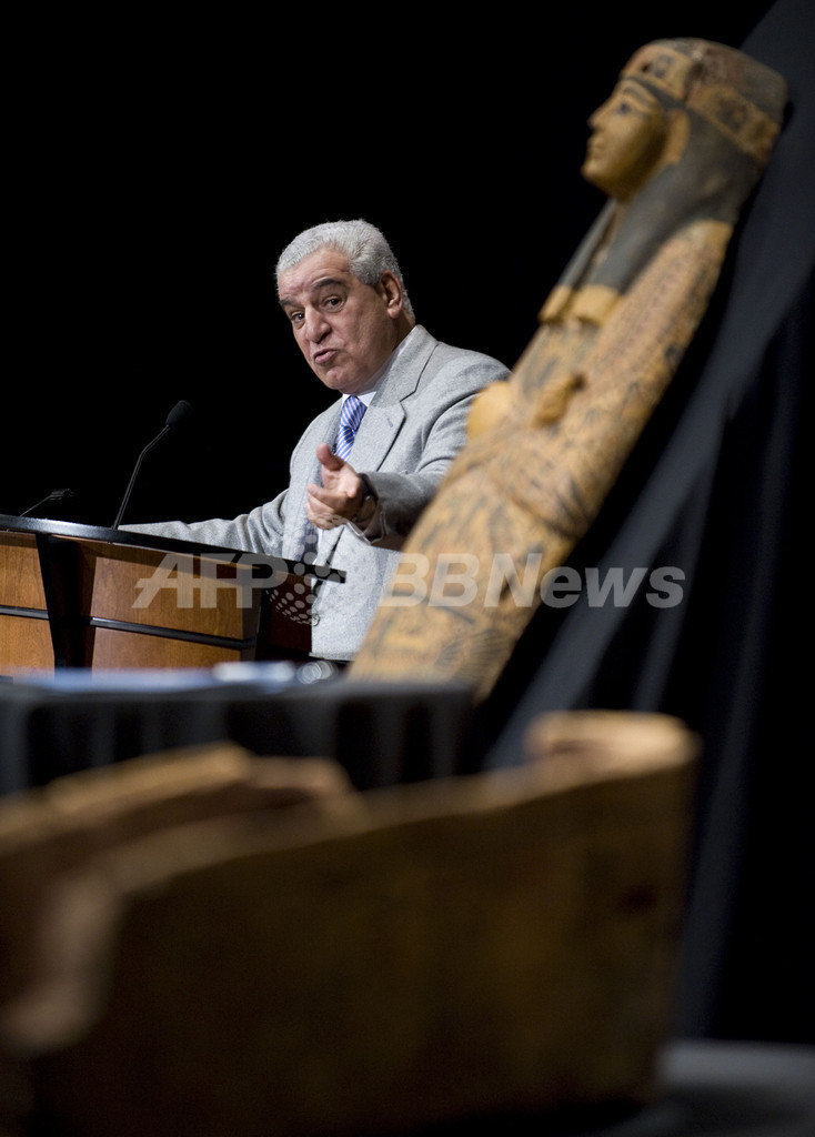 米マイアミ(Miami)の空港で2008年に押収された古代エジプトのサルコファガス(大理石の石棺)がエジプトへ返還されることになり、9日、ワシントンD.C.(Washington D.C.)のナショナルジオグラフィック協会(National Geographic Society)で返還式典が行われた。写真は、返還されるサルコファガスと、すピーチを行うエジプト考古最高評議会(Egyptian Supreme Council of Antiquities)のザヒ・ハワス(Zahi Hawass)事務局長(2010年3月10日撮影)。(c)AFP/Jewel SAMAD