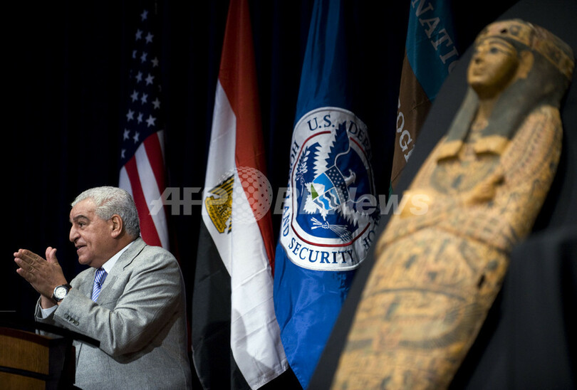米マイアミ(Miami)の空港で2008年に押収された古代エジプトのサルコファガス(大理石の石棺)がエジプトへ返還されることになり、9日、ワシントンD.C.(Washington D.C.)のナショナルジオグラフィック協会(National Geographic Society)で返還式典が行われた。写真は、返還されるサルコファガスと、すピーチを行うエジプト考古最高評議会(Egyptian Supreme Council of Antiquities)のザヒ・ハワス(Zahi Hawass)事務局長(2010年3月10日撮影)。(c)AFP/Jewel SAMAD