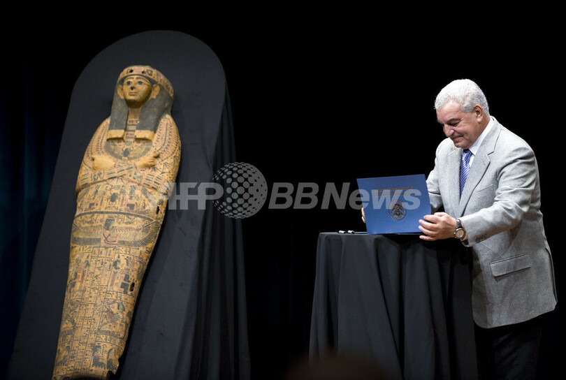 米マイアミ(Miami)の空港で2008年に押収された古代エジプトのサルコファガス(大理石の石棺)がエジプトへ返還されることになり、9日、ワシントンD.C.(Washington D.C.)のナショナルジオグラフィック協会(National Geographic Society)で返還式典が行われた。写真は、返還されるサルコファガスと、すピーチを行うエジプト考古最高評議会(Egyptian Supreme Council of Antiquities)のザヒ・ハワス(Zahi Hawass)事務局長(2010年3月10日撮影)。(c)AFP/Jewel SAMAD