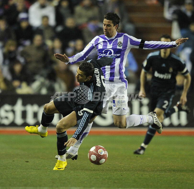 写真はレアル・バジャドリードのアシエル・デル・オルノ(%%Asier Del Horno%%)と競り合うレアル・マドリードのクリスティアーノ・ロナウド(%%Cristiano Ronaldo%%、左)。(2010年3月14日撮影)(c)AFP/PIERRE-PHILIPPE MARCOU