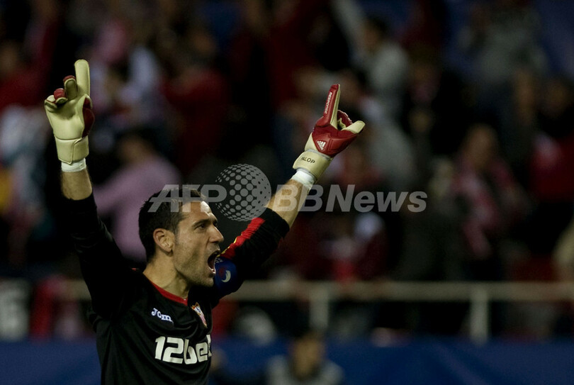 写真は前半41分にディエゴ・ペロッティ(%%Diego Perotti%%)が決めた同点ゴールを喜ぶセビージャのアンドレス・パロップ(%%Andres Palop%%)。(2010年3月16日撮影)(c)AFP/JORGE GUERRERO