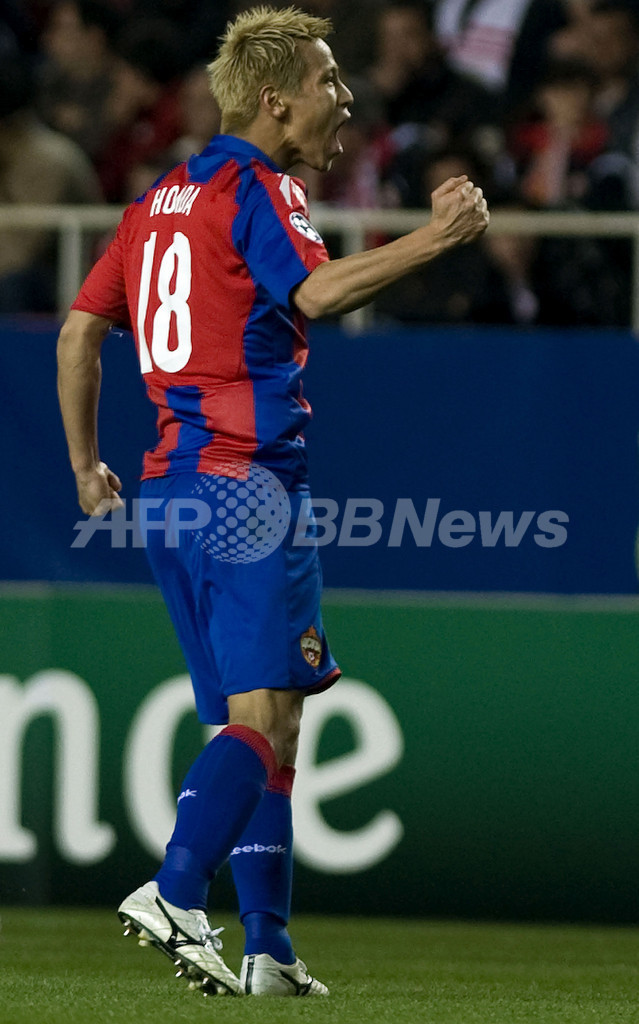 写真は後半10分に決勝点を決めて喜ぶCSKAモスクワの本田圭佑(%%Keisuke Honda%%)。(c)AFP/JORGE GUERRERO