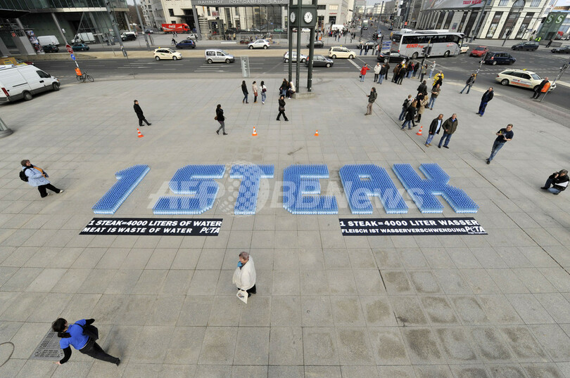 22日の「世界水の日(World Water Day)」を3日後に控えた19日、ドイツ・ベルリン(Berlin)のポツダム広場(Potsdamer Platz)で、国際動物愛護団体「動物の倫理的扱いを求める人々の会(People for the Ethical Treatment of Animals、PETA)が4000本のミネラルウォーターの瓶を「1Steak(ステーキ1つ)」の文字の形に並べるパフォーマンスを行った。PETAは1人分のステーキを作るのに4000リットルの水が浪費されているとして、菜食をするよう呼びかけた(2010年3月19日撮影)。(c)AFP/JOHN MACDOUGALL