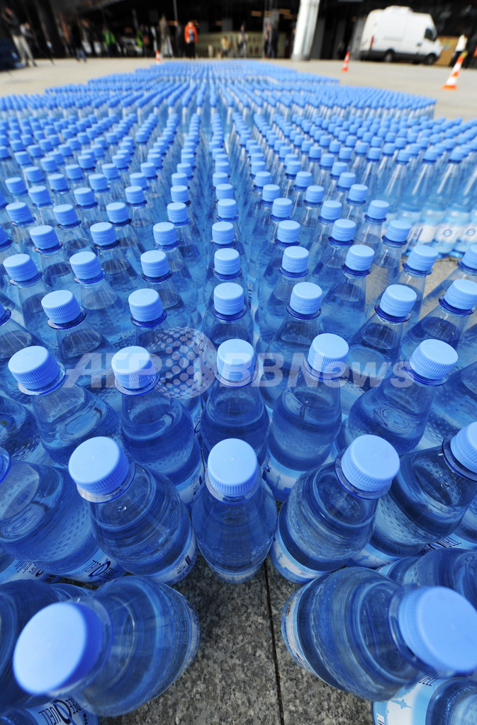 22日の「世界水の日(World Water Day)」を3日後に控えた19日、ドイツ・ベルリン(Berlin)のポツダム広場(Potsdamer Platz)で、国際動物愛護団体「動物の倫理的扱いを求める人々の会(People for the Ethical Treatment of Animals、PETA)が4000本のミネラルウォーターの瓶を「1Steak(ステーキ1つ)」の文字の形に並べるパフォーマンスを行った。PETAは1人分のステーキを作るのに4000リットルの水が浪費されているとして、菜食をするよう呼びかけた(2010年3月19日撮影)。(c)AFP/JOHN MACDOUGALL