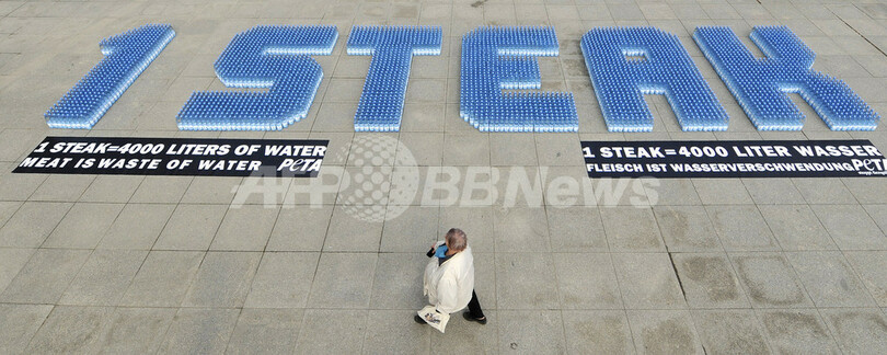 22日の「世界水の日(World Water Day)」を3日後に控えた19日、ドイツ・ベルリン(Berlin)のポツダム広場(Potsdamer Platz)で、国際動物愛護団体「動物の倫理的扱いを求める人々の会(People for the Ethical Treatment of Animals、PETA)が4000本のミネラルウォーターの瓶を「1Steak(ステーキ1つ)」の文字の形に並べるパフォーマンスを行った。PETAは1人分のステーキを作るのに4000リットルの水が浪費されているとして、菜食をするよう呼びかけた(2010年3月19日撮影)。(c)AFP/JOHN MACDOUGALL