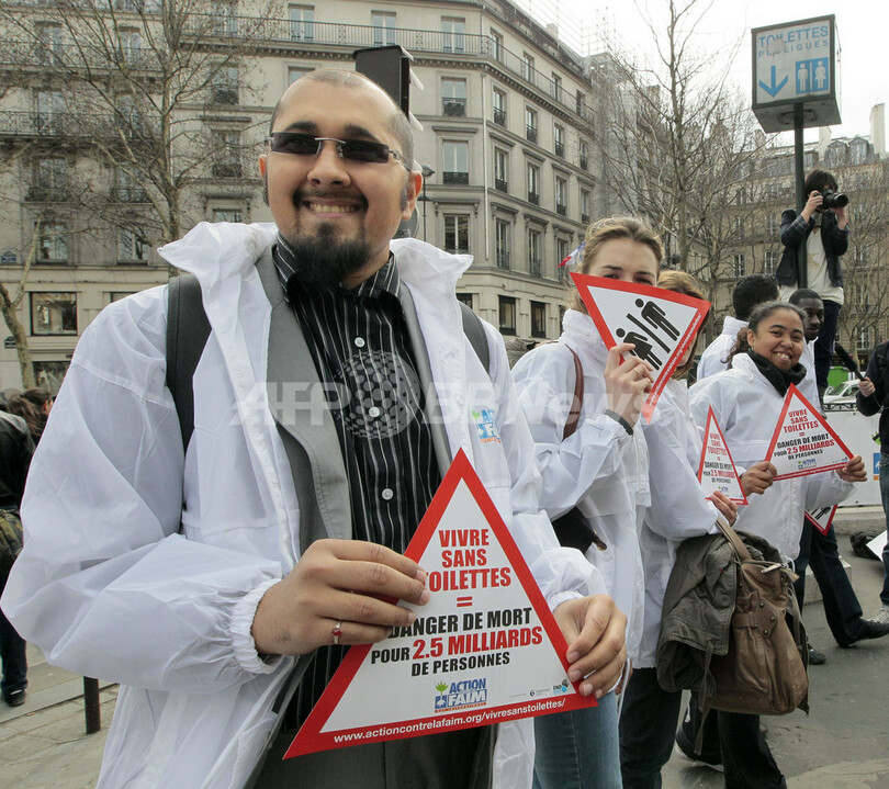 【3月20日 AFP】22日の「世界水の日(World Water Day)」を3日後に控えた19日、非政府組織「Action contre la faim(飢餓に対するアクション)」は世界で25億人以上がトイレがない生活を送っていることに注目してもらおうと、フランス・パリ(Paris)最古の公衆トイレに並ぶフラッシュ・モブ(インターネット上の呼びかけに応じた参加者が直接現地に集合するイベント)を行った。トイレがない不衛生な生活環境は死の危険ももたらすという。(c)AFP