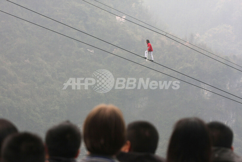 Zhangjiajie)で綱渡りに挑戦した。(c)AFP