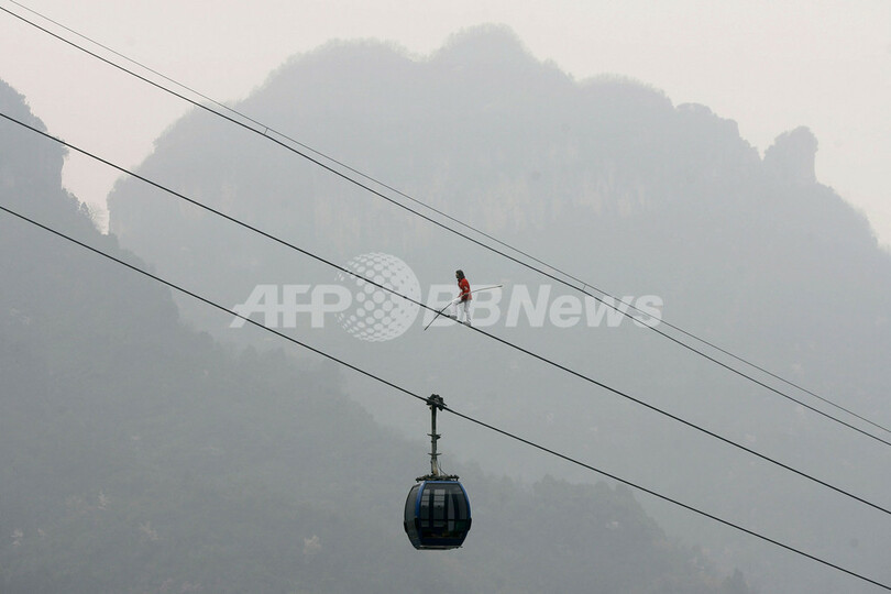 Zhangjiajie)で綱渡りに挑戦した。(c)AFP