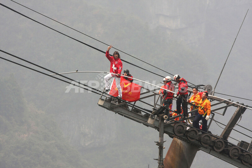 スイスの綱渡り冒険家フレディ・ノック(Freddy Nock)さんが20日、世界自然遺産にも登録された奇峰群で知られる中国・湖南(Hunan)省の張家界(Zhangjiajie)で綱渡りに挑戦した。ノックさんは奇峰の1つ、かつて南天一柱(South Sky Pillar)と呼ばれていた「アバター・ハレルヤ山(Avatar Hallelujah Mountain)」の頂上に向かうロープウエーのケーブル上をポールでバランスをとりながら歩き出したが、全長690メートルのうち200メートルの地点で断念した。南天一柱は、米国の大ヒット映画『アバター(Avatar)』に登場する風景に酷似していると話題になり、公式にアバター・ハレルヤ山に改名された。
