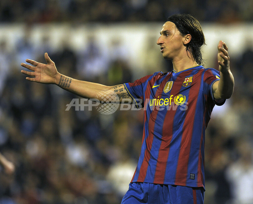 写真は得点機を逸して落胆するバルセロナのズラタン・イブラヒモビッチ(%%Zlatan Ibrahimovic%%)。(2010年3月21日撮影)(c)AFP/LLUIS GENE