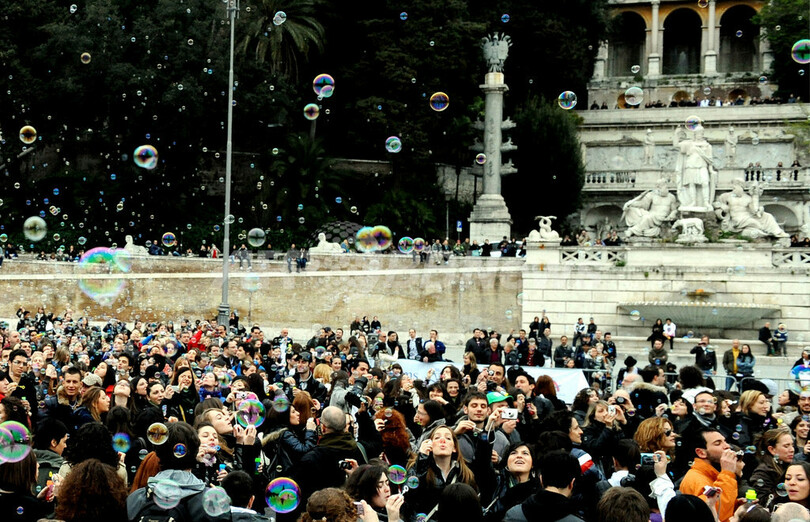 【3月22日 AFP】イタリア・ローマ(Rome)で21日、ポポロ広場(Piazza del Popolo)にシャボン玉を吹く人びとの大集団が出現した。見知らぬ人びとがインターネットの呼びかけに応じて特定の場所に集結するイベント「フラッシュモブ」によるもので、広場では春の陽光のなかを数千のシャボン玉が漂っていた。(c)AFP