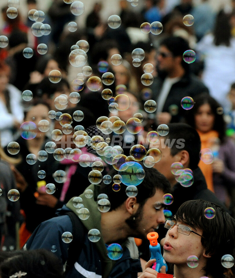 イタリア・ローマ(Rome)で21日、ポポロ広場(Piazza del Popolo)にシャボン玉を吹く人びとの大集団が出現した。見知らぬ人びとがインターネットの呼びかけに応じて特定の場所に集結するイベント「フラッシュモブ」によるもので、広場では春の陽光のなかを数千のシャボン玉が漂った(2010年3月21日撮影)。(c)AFP/Tiziana Fabi