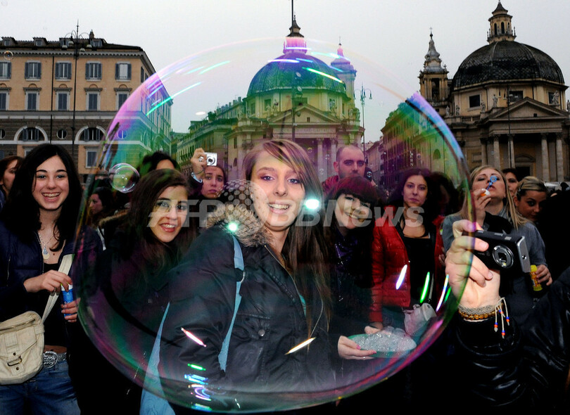【3月22日 AFP】イタリア・ローマ(Rome)で21日、ポポロ広場(Piazza del Popolo)にシャボン玉を吹く人びとの大集団が出現した。見知らぬ人びとがインターネットの呼びかけに応じて特定の場所に集結するイベント「フラッシュモブ」によるもので、広場では春の陽光のなかを数千のシャボン玉が漂っていた。(c)AFP