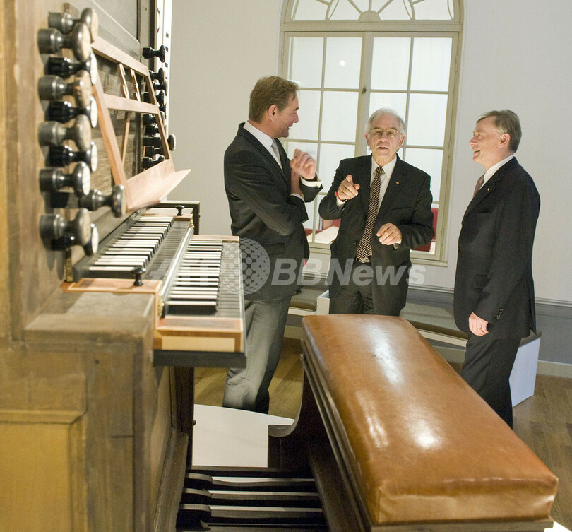 ドイツの作曲家ヨハン・セバスチャン・バッハ(Johann Sebastian Bach)生誕325年を翌日に控えた20日、ドイツ東部ライプチヒ(Leipzig)にあるバッハ博物館(Bach Museum)が、改修を終え再オープンした。写真は、バッハ博物館にあるバッハのオルガンの横でクリストフ・ウォルフ(Christoph Wolff)館長(中)と歓談するホルスト・ケーラー(Horst Koehler)独大統領(右)とブルクハルト・ユンク(Burkhard Jung)ライプチヒ市長(左、2010年3月21日撮影)。(c)AFP/BUNDESREGIERUNG/GUIDO BERGMANN