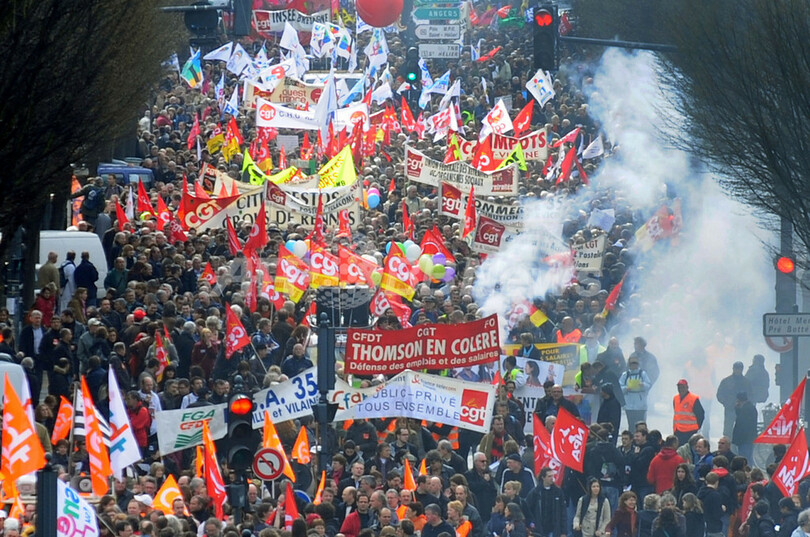フランス各地では同日、年金問題や雇用問題をめぐって、数十万人規模の大規模なストライキや抗議活動が行われた。地方選でも大敗を喫するなど、サルコジ大統領に対する非難の声が高まっている。(c)AFP