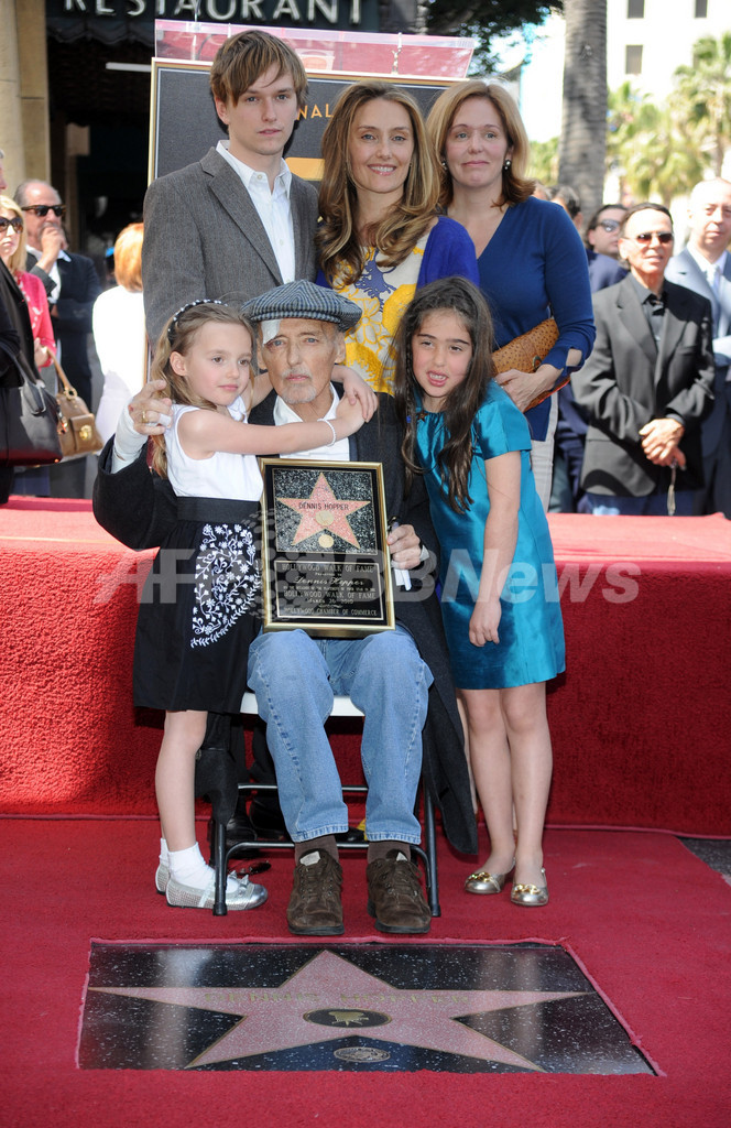 映画『イージー・ライダー(Easy Rider)』や『地獄の黙示録(Apocalypse Now)』などで知られる米俳優デニス・ホッパー(Dennis Hopper)さんがハリウッドの殿堂「ウォーク・オブ・フェーム(Hollywood Walk of Fame)」入りを果たし、26日に米ハリウッド(Hollywood)で記念式典が開かれた。写真は式典で家族と記念撮影するデニス・ホッパーさん(前列中央、2010年3月26日撮影)。(c)AFP/Getty Images/Frazer Harrison