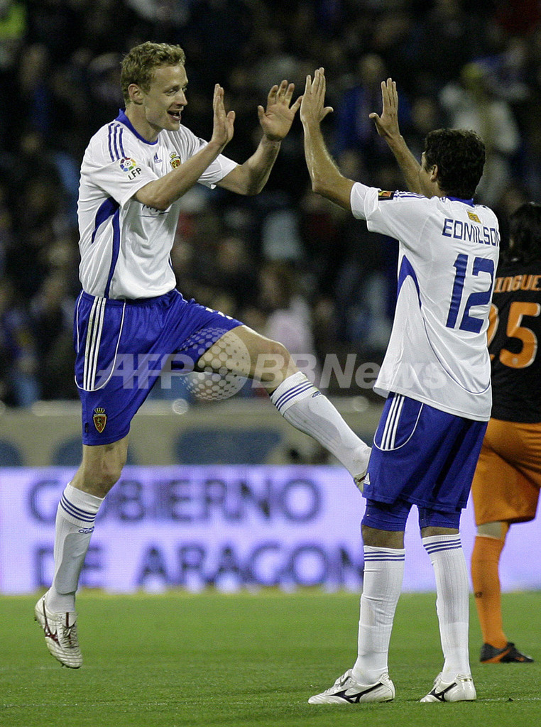 写真は後半26分にチームの3点目を決め、エジミウソン(%%Edmilson%%)と喜びを分かち合うサラゴサのイリ・ヤロシク(%%Jiri Jarosik%%、左)。(2010年3月27日撮影)(c)AFP/JOSEP LAGO