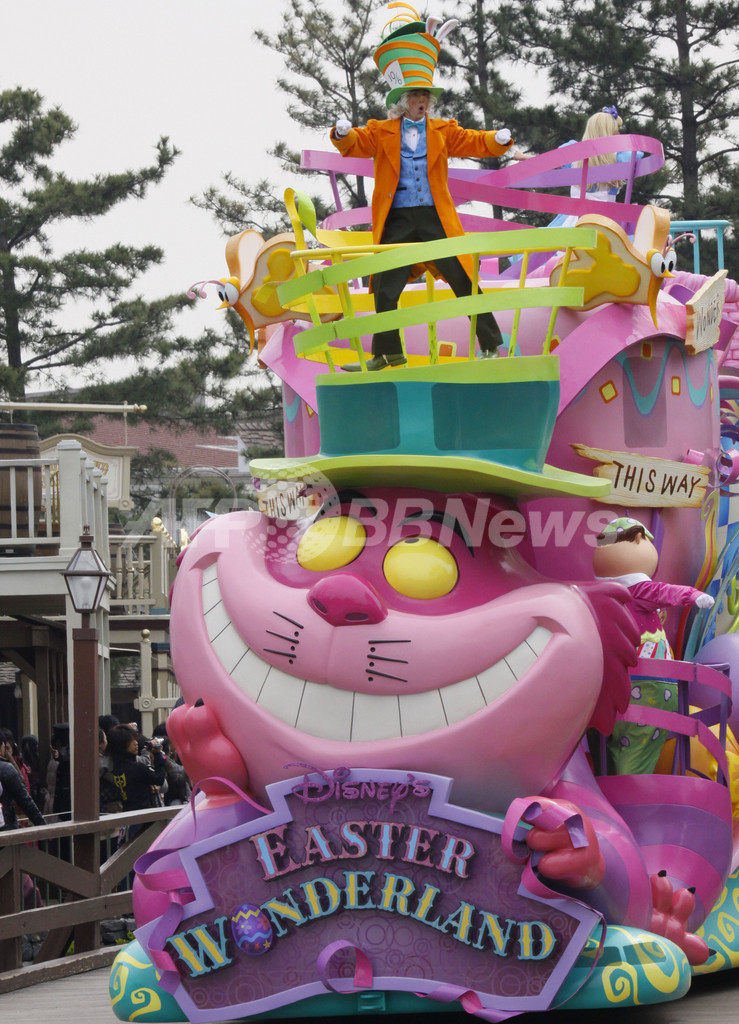 写真は、報道陣向けに行われたスペシャルパレード「ディズニー・イースターワンダーランド」の内覧会で、チェシャ猫をかたどったフロート(山車)の上で踊るマッドハッター(2010年3月31日撮影)。(c)AFP/Yoshikazu TSUNO