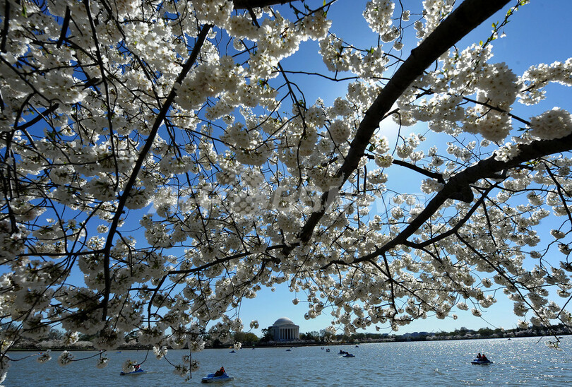 写真は、満開の桜並木を眺めながらボート遊びを楽しむ人々。奥に見えるのはジェファーソン記念堂(Jefferson Memorial、2010年3月31日撮影)。(c)AFP/Jewel SAMAD