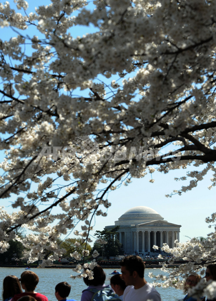 写真は、満開の桜を楽しむ人々とジェファーソン記念堂(Jefferson Memorial、2010年3月31日撮影)。(c)AFP/Jewel SAMAD