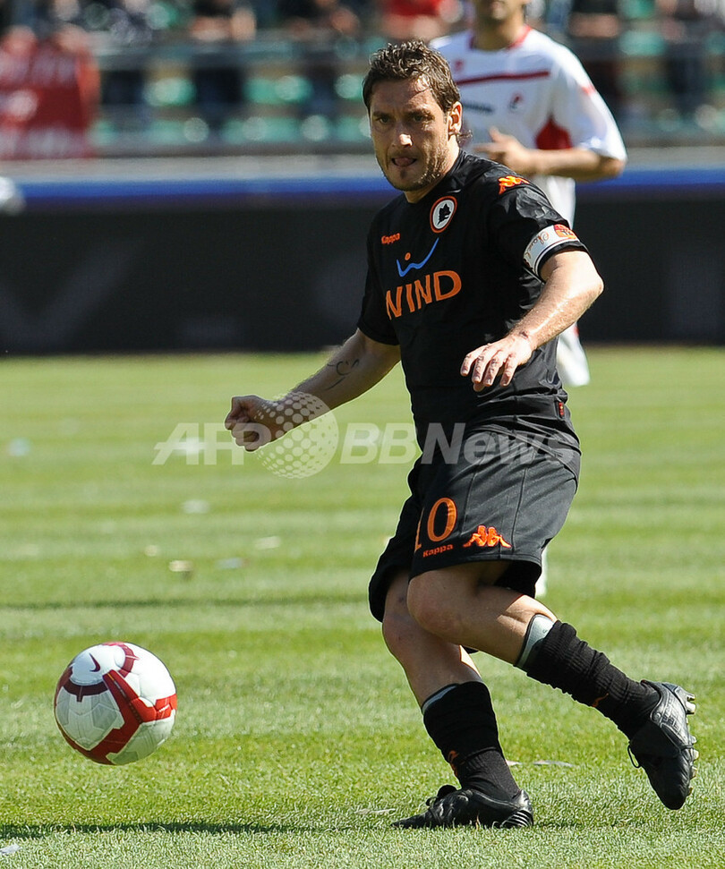 写真はボールをコントロルするローマのフランチェスコ・トッティ(%%Francesco Totti%%)。(2010年4月3日撮影)(c)AFP/ANDREAS SOLARO