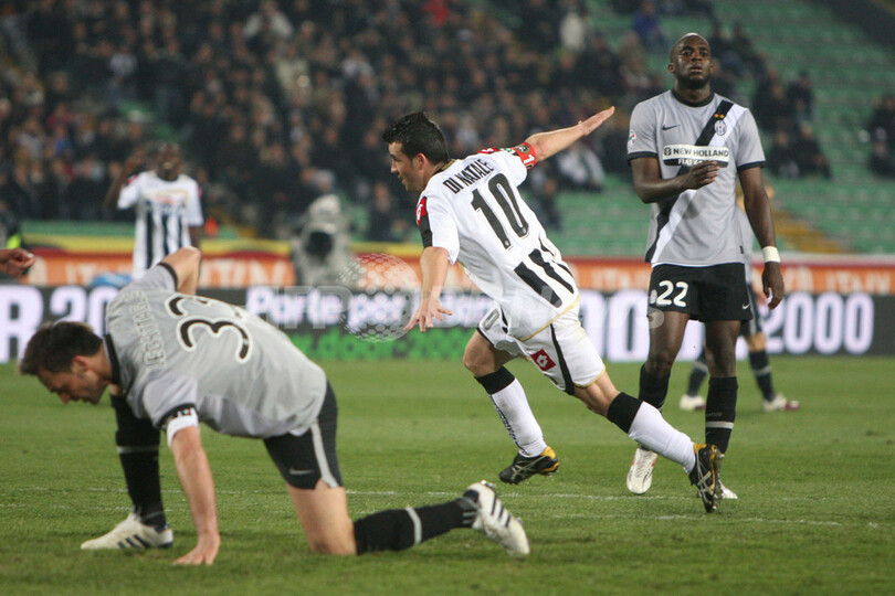 写真は後半30分にチームの3点目を決めて歓喜するウディネーゼのアントニオ・ディ・ナターレ(%%Antonio Di Natale%%、中央)。(2010年4月3日撮影)(c)AFP/ANTEPRIMA