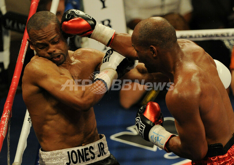 写真はロイ・ジョーンズJrを攻めるバーナード・ホプキンス(右)。(2010年4月3日撮影)(c)AFP/MARK RALSTON