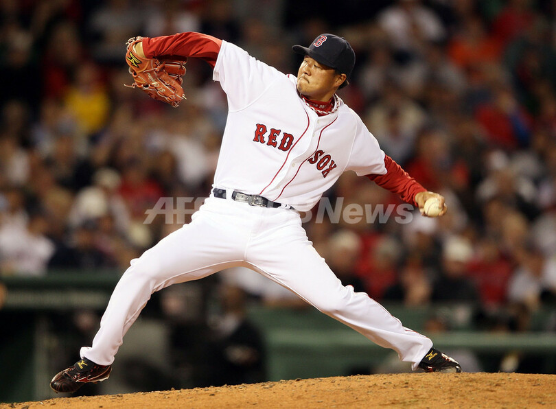 レッドソックスの岡島秀樹(Hideki Okajima)は7回途中から4番手で登板し、1回を1安打無失点で勝ち投手となった。(c)AFP
