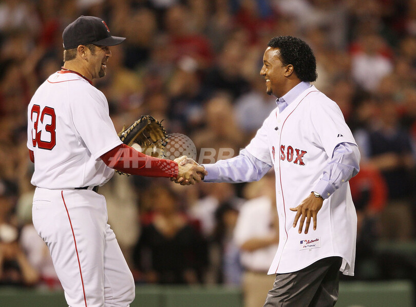 写真は始球式を終え、ジェイソン・バリテック(%%Jason Varitek%%)と握手を交わす元レッドソックスのペドロ・マルチネス(%%Pedro Martinez%%、右)。(2010年4月4日撮影)(c)AFP/Getty Images/Elsa
