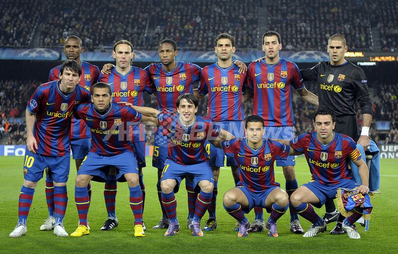 写真は試合前の写真撮影に臨むバルセロナの先発メンバー。(2010年4月6日撮影)(c)AFP/LLUIS GENE
