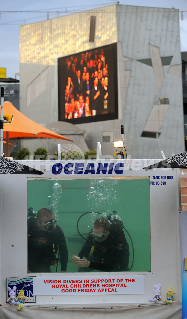 【4月5日 AFP】オーストラリアのメルボルン(Melbourne)で2日、「水中で行う三目並べ(○×ゲーム)」のギネス世界記録(Guinness World Records)への挑戦が行われた。現在の世界記録は24時間。挑戦者2人は、36時間を目指すという。記録挑戦は、キリスト教の復活祭(イースター、Easter)前の聖金曜日の、メルボルンの「ロイヤル小児病院(Royal Children's Hospital)」への募金活動のために行われた。(c)AFP