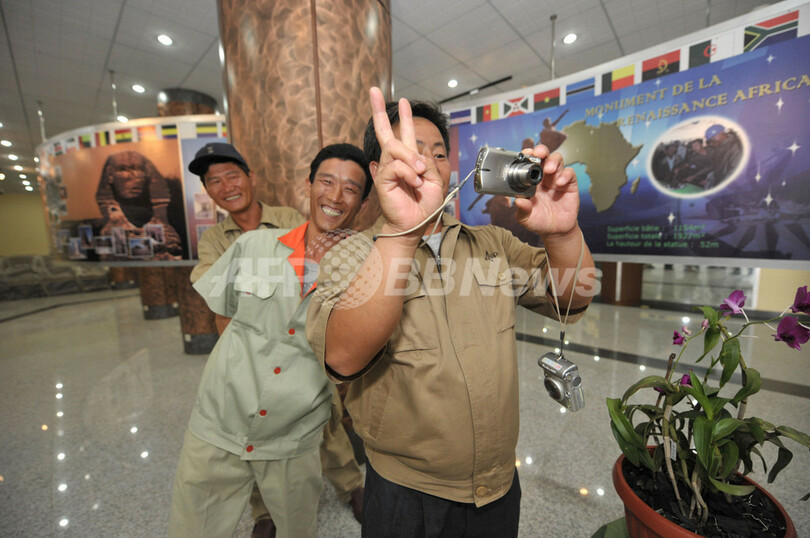 写真は、公開前日に記念写真を撮る北朝鮮の建設作業員(2010年4月2日撮影)。(c)AFP/SEYLLOU