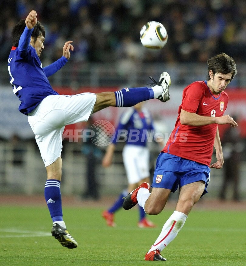 写真は日本の阿部勇樹(%%Yuki Abe%%、左)とボールを競り合うセルビアのデヤン・レキッチ(%%Dejan Lekic%%)。(2010年4月7日撮影)(c)AFP/KAZUHIRO NOGI