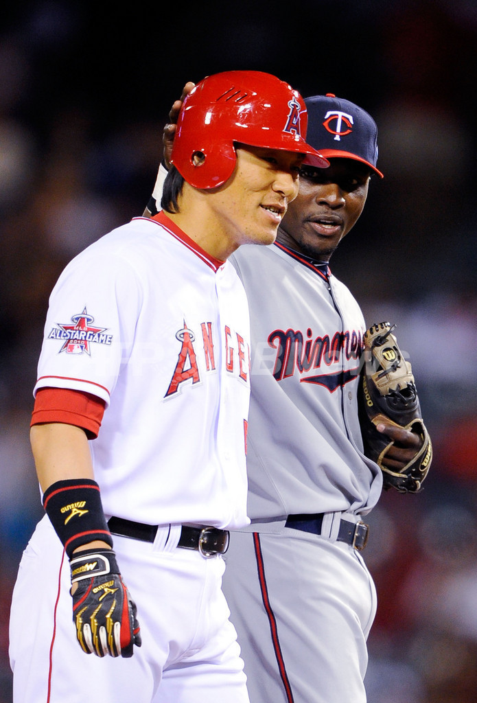写真は安打を放ち、ツインズのオーランド・ハドソン(%%Orlando Hudson%%)から祝福されるエンゼルスの松井秀喜(左)。(2010年4月7日撮影)(c)AFP/Getty Images/Kevork Djansezian